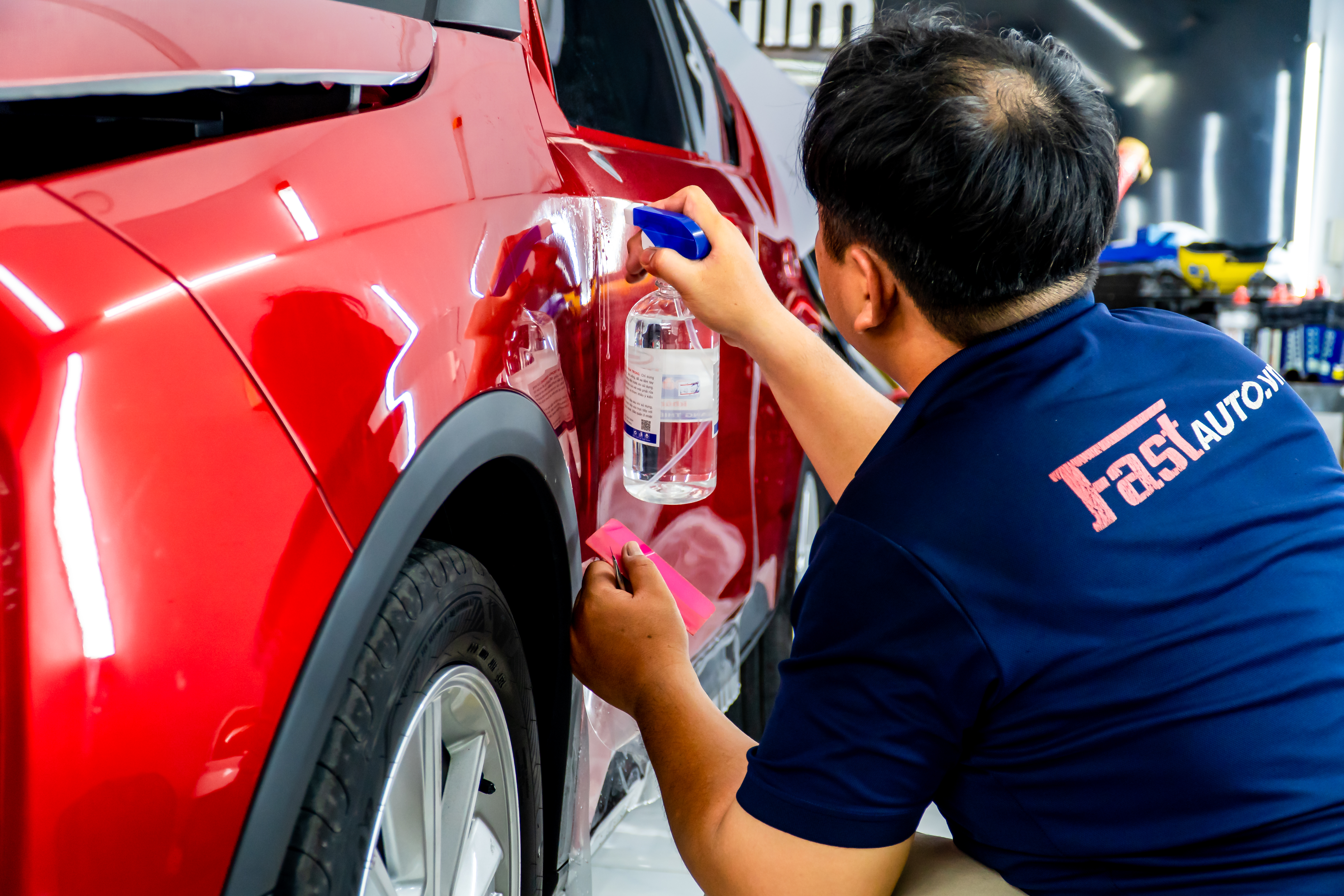 Kỹ thuật viên sử dụng gạt mềm để đẩy nước và bọt khí ra ngoài, đảm bảo phim phẳng tuyệt đối và ôm sát các đường cong của xe.