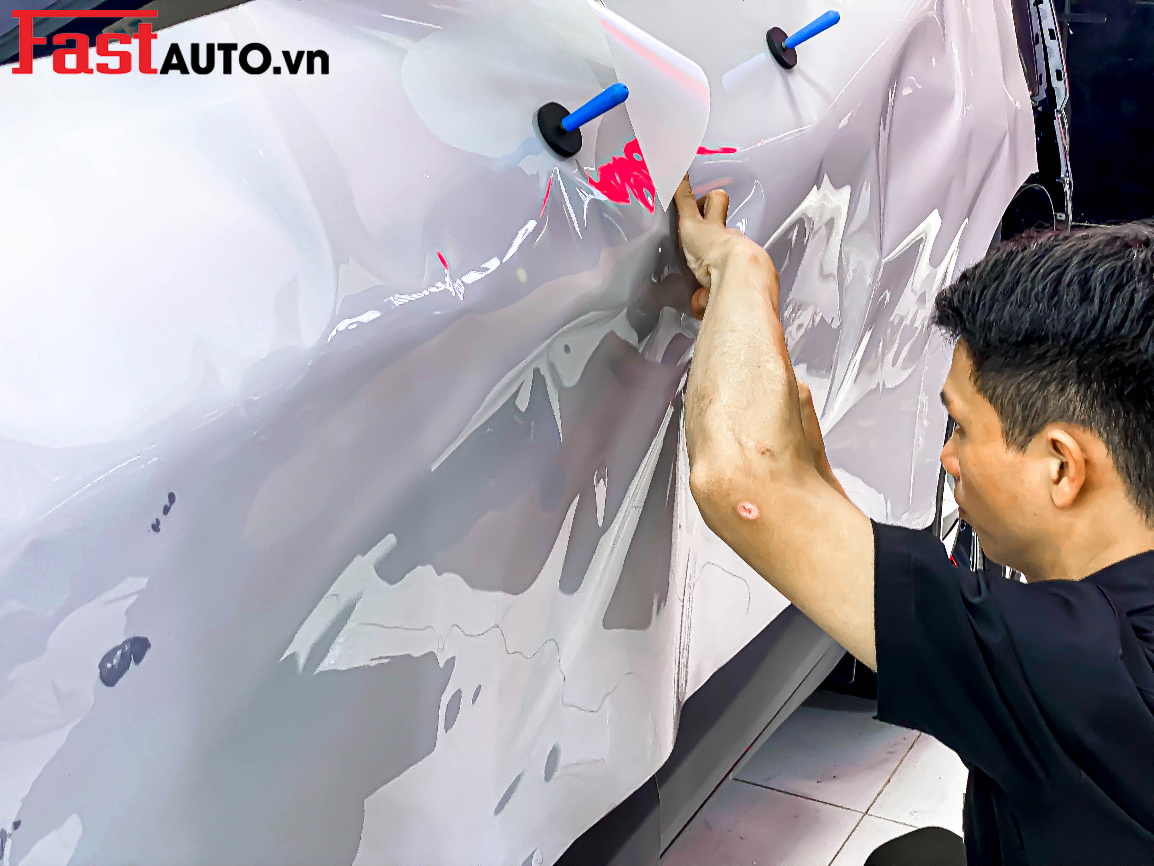 An toàn tuyệt đối: Phim được cắt bằng máy CNC trước khi dán, giúp ôm sát các chi tiết như tay nắm cửa, gương chiếu hậu và các đường gân dập nổi mà không lo trầy xước sơn nguyên bản.