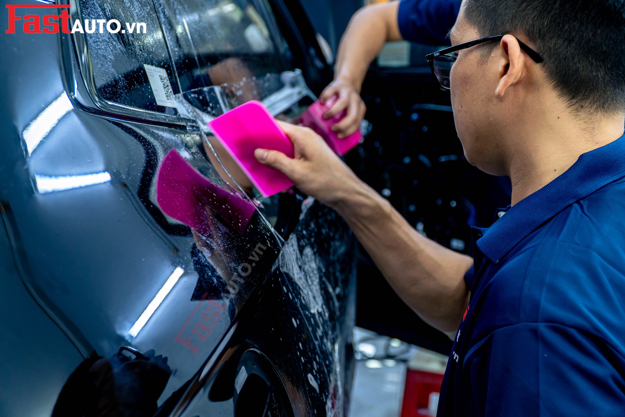 Kỹ thuật viên sử dụng gạt mềm để đẩy nước và bọt khí ra ngoài, đảm bảo phim phẳng tuyệt đối và ôm sát các đường cong của xe.