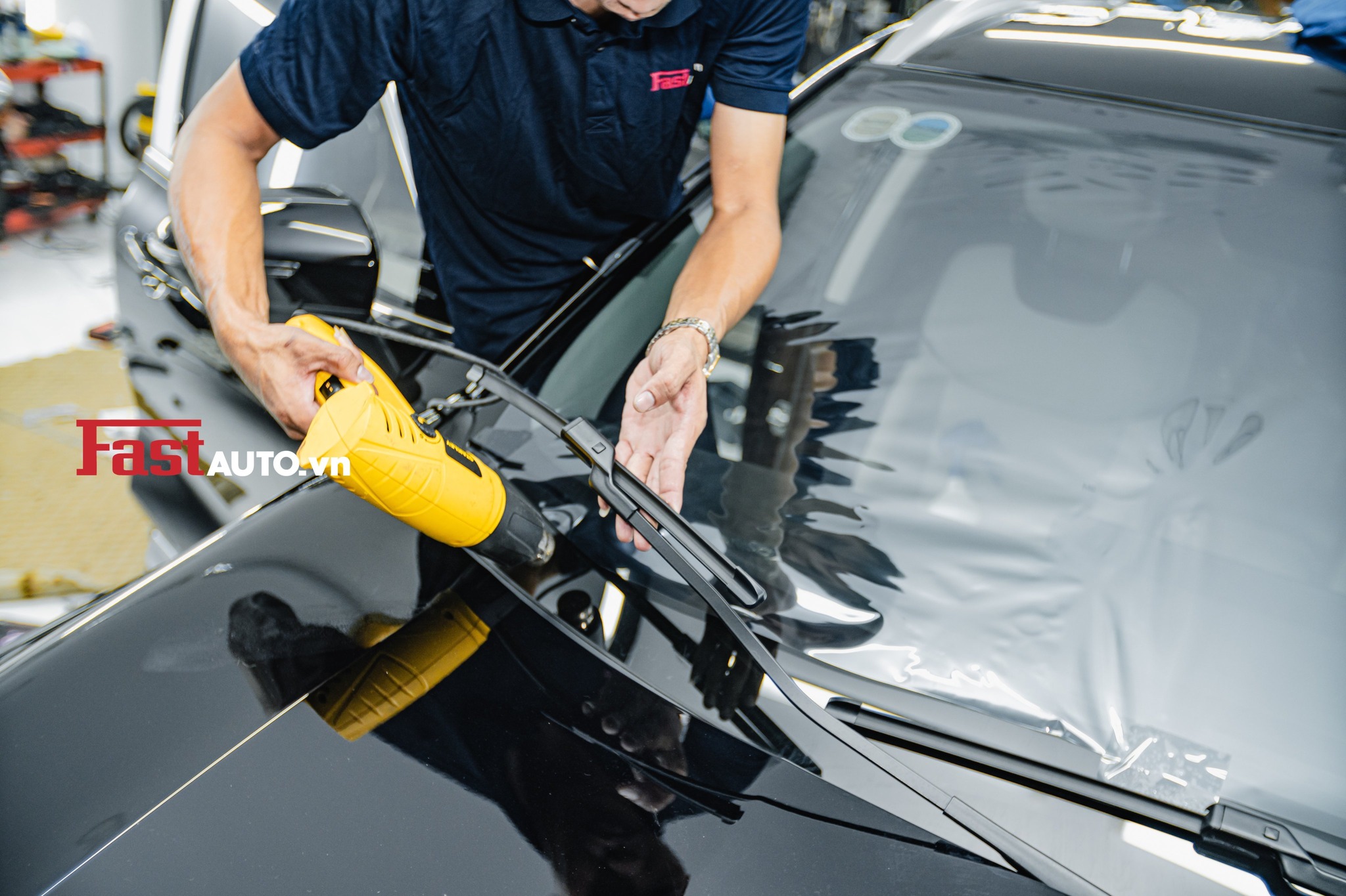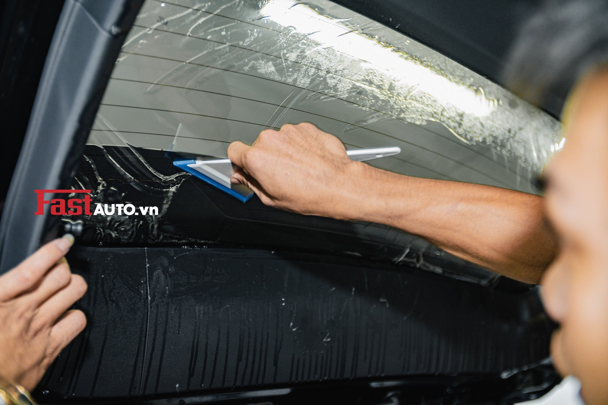 Kỹ thuật viên sử dụng gạt mềm để đẩy nước và bọt khí ra ngoài, đảm bảo phim phẳng tuyệt đối và ôm sát các đường cong của xe.